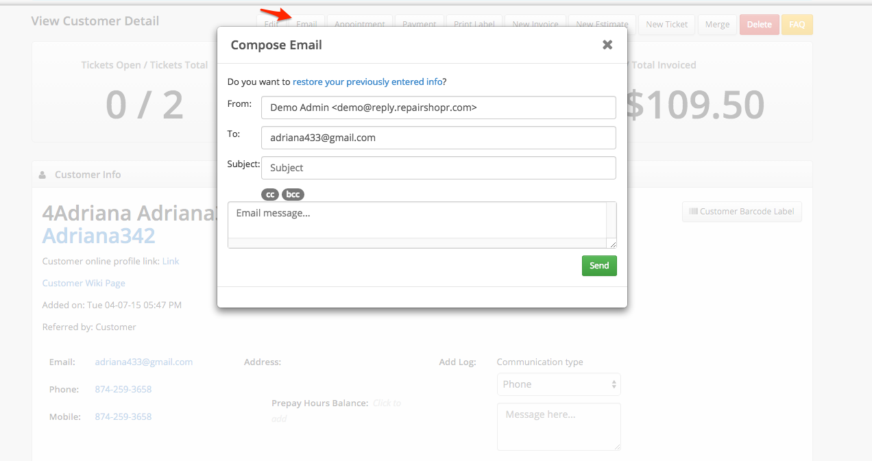 - Added an email button to the Customer page, now you can email them (3 way email) and we’ll surface email bounces there much more prominently.