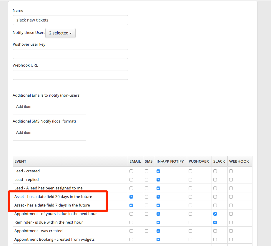 Asset tracking has always been there, but the date feature didn’t have a good alert or filter. Now you can setup an Asset Type like “SSL Certificate”, “Domain”, “Server”, etc – and put a custom field on all of them called “Expiration Date”. Then you can use the new Notification Center rules for 30 day and 7 day alerts on those dates.