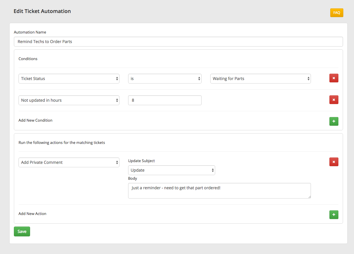 - Ticket Automations – Automations are basically if/then statements designed to save you time. They allow you to set rules like “If a ticket in the status ‘Waiting for Customer’ hasn’t been updated in 3 days, then send an email to X and change the status.” Head to Admin – Ticket Automations to play with it.